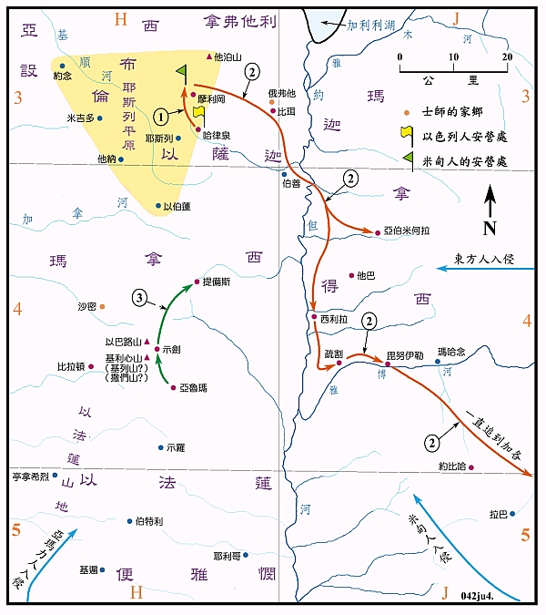 他們圍着軍營,各人站在自己的地方;全營的人都逃竄,一面喊,一面逃跑。三百人就吹角,耶和華使全營的人用刀自相擊殺。全營的人逃往西利拉的伯‧哈示他,那邊靠近約旦河,因此基甸叫那些從拿弗他利、亞設和瑪拿西全地來的以色列人一起追趕米甸人,又叫以法蓮人守約旦河,不讓他們逃走。