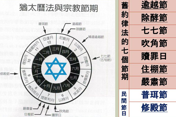 新年,吹角節和贖罪日,大家都還有印象吧。據說在猶大國滅亡,猶太人被擄到巴比倫,回到猶大地之後,因為許多原因,猶太人將新年的慶祝從春天改到秋天,剛好與吹角節(7月1 日)合併了。吹角節吹角,是呼召人作反省和悔改,預備贖罪日的來臨。新年一共有十天,是反省悔改的時期,第十天是贖罪日,也是一年最莊重嚴肅的日子,大祭司每年唯一可以進入至聖所的日子。