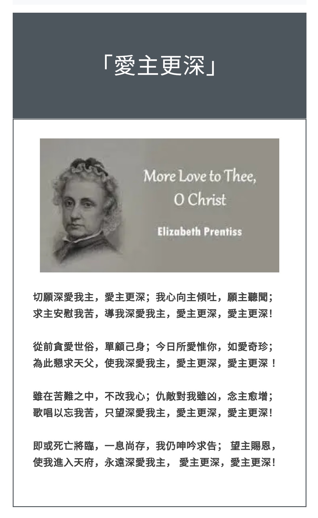這首聖詩深深地打動到伊莉莎白的心,並且讓她再次想起幾年前失去兩個孩子後從神那裏得到的安慰及自己所立下的心志,要以更加愛主來回報神的愛。於是她拿起筆步莎拉詩歌的原韻寫下了這首《愛主更深》;在創作中她也反復用了14次的“更愛我主”(More Love to Thee)來突出自己的心願。