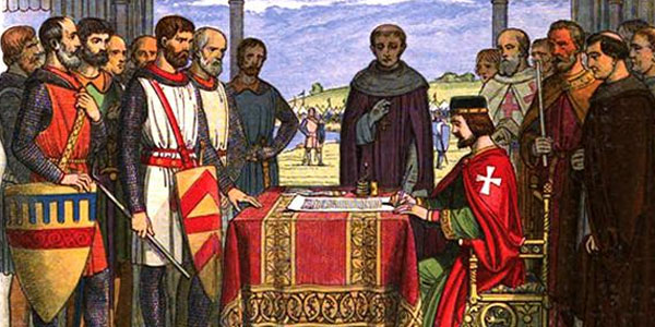 君權神授在歷史上的發展,直到1215年時,英國《大憲章》(The Great Charter)的制定,以法律限制君王的權利,人權不應在君王的獨裁統治下被侵犯,君王不應當隨意生殺百姓。在人類漫長的歷史洪流中,人對自身人權的覺悟並不是件容易的事,是歷經了幾千年才感到應當挑戰君王的權柄,君權被挑戰的君王對此相當不滿,因而產生君權與人權的相抗,人在王位上的把握越來越減少。不到二百年,英國的《大憲章》產生人類第一次最可怕的反應,就是把他們的王殺死。1215年《大憲章》的訂定,是對人權尊重的歷史轉捩點。為什麼《大憲章》有這麼大的影響力?因為這是上帝的干預,因此上帝許可《大憲章》的訂定。大憲章的拉丁文是 Magna Carta,就是偉大的憲章的意思,它告訴我們無論哪一個人統治世界,都有約束他的法律。當法律限制君王的權柄,人民因此得以抬頭。