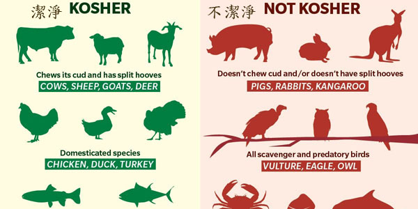 在神起初創造這個世界時,神把蔬菜和水果賜給亞當和夏娃作為食物;在大洪水之後,神又把動物賜給挪亞和他的後裔作為食物。然後在以色列人出埃及之後,神正式宣告,哪些是不潔的動物,哪些是潔淨可食的動物。潔淨的肉食,表示是適合人吃的肉食,也表示是乾淨、完整、無瑕的肉;不潔淨的動物包括自死的或是被野獸撕裂的,當然也有人吃,但是吃了不一定對健康有益。例如,現在有一些地方流行豬瘟疫,有的生意人把病死的豬也拿去做香腸,醃肉,等等,不知內情的人吃了生病都不知道是怎麼回事,十分可怕。