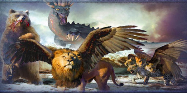〈但以理书〉的结构是在第一至第六章先叙述一些重要事件,第七章之后全是异象和预言,并不是按著时间的秩序排列。这件事发生在伯沙撒王元年,但以理在梦里看到一个极大的异象:“天的四风陡起,刮在大海之上”,就像台风来临一样,警告有事情要发生了。接着有四个形状不同的大兽轮流从海中上来:第一个兽像狮子,有鹰的翅膀。这兽可以说是象征著巴比伦,因为狮子是百兽之王,鹰是百禽之霸;考古学家也曾经在巴比伦的遗址里挖掘出狮身鹰翅的图形。