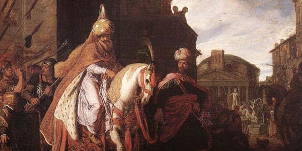 王一旦得知哈曼来了,就叫他进来,问他:“王所喜悦尊荣的人,当如何待他呢?”这时的哈曼满心都是骄傲和自满,认为全天下就只有他是王最喜爱的人。因此按着他心中想要的愿望去回答:“王所喜悦尊荣的人,当将王常穿的朝服和戴冠的御马,都交给王极尊贵的一个大臣,命他将衣服给王所喜悦尊荣的人穿上,使他骑上马,走遍城里的街市,在他面前宣告说:‘王所喜悦尊荣的人,就如此待他’。”他的心里可能也出现了自己穿着王的朝服,骑在戴冠的御马上,神气非凡。不料王接着说:“你速速将这衣服和马,照你所说的,向坐在朝门的犹大人末底改去行。凡你所说的一样不可缺。”
