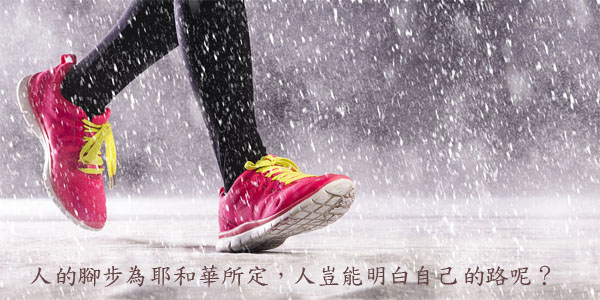 「人的腳步為耶和華所定,人豈能明白自己的路呢? (箴言20:24) 」 自己的腳步,是未來的方向。連腳步都不是自己能決定,自己未來的路不是自己能明白。我們只能將目前的工作做好,未來呢?只能交託主。
