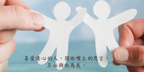 箴言22:11 喜爱清心的人,因他嘴上的恩言,王必与他为友。