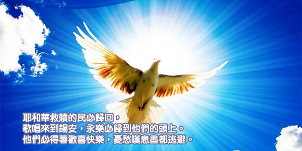 以賽亞書 35: 10 並且耶和華救贖的民必歸回,歌唱來到錫安,永樂必歸到他們的頭上。他們必得著歡喜快樂,憂愁嘆息盡都逃避。