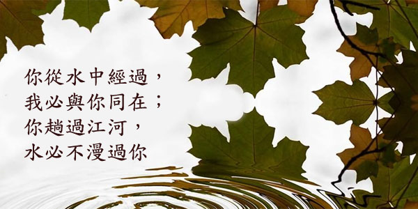 以賽亞書43:2 你從水中經過,我必與你同在;你趟過江河,水必不漫過你;你從火中行過,必不被燒,火焰也不著在你身上。