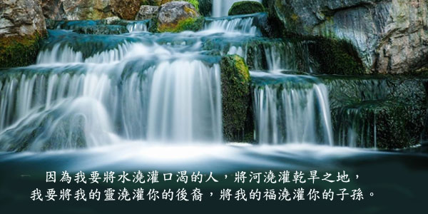 以赛亚书44:3 因为我要将水浇灌口渴的人,将河浇灌干旱之地,我要将我的灵浇灌你的后裔,将我的福浇灌你的子孙。
