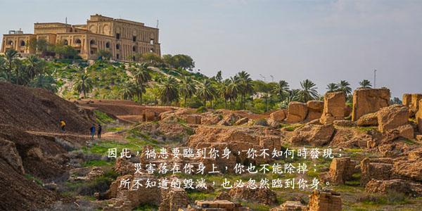 8 「你這專好宴樂,安然居住的,現在當聽這話!你心中說:『唯有我,除我以外再沒有別的。我必不致寡居,也不遭喪子之事。』 9 哪知,喪子、寡居這兩件事在一日轉眼之間必臨到你,正在你多行邪術、廣施符咒的時候,這兩件事必全然臨到你身上。10 「你素來倚仗自己的惡行,說:『無人看見我。』你的智慧、聰明使你偏邪,並且你心裡說:『唯有我,除我以外再沒有別的。』11 「因此,禍患要臨到你身,你不知何時發現;災害落在你身上,你也不能除掉;所不知道的毀滅,也必忽然臨到你身。