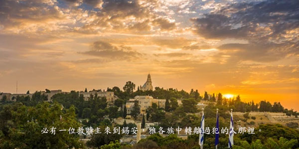以賽亞書59: 20 「必有一位救贖主來到錫安,雅各族中轉離過犯的人那裡。」這是耶和華說的。