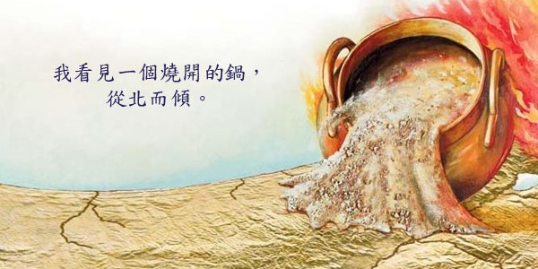 耶利米看到的第二個異象是一個燒開的鍋,從北而傾。神自己向耶利米解釋:這個異象代表必有災禍從北方發出,臨到這地的一切居民。亞述,巴比倫,埃及三國那時正在爭取世界霸權。亞述位於伯拉河(即幼發拉底河Euphrates)流域的北部,以尼尼微為首都,已統治世界三百年之久,但現在已日漸衰弱;巴比倫位於幼發拉底河流域的南部,漸漸興起為強國;埃及位於尼羅河流域,在猶大的南部。所以北方來的災禍喻表巴比倫的來襲。因為百姓不理會約西亞的教導和呼籲,不肯歸向耶和華,繼續拜偶像,所以神要藉著巴比倫來攻擊他們。今天我們常常指責執政者離開神,卻輕看了百姓的罪。但是這個燒開的鍋要讓我們明白,不是因為約西亞王有過,乃是百姓得罪神的後果。所以我們有自己的責任,做一個歸向神的百姓。
