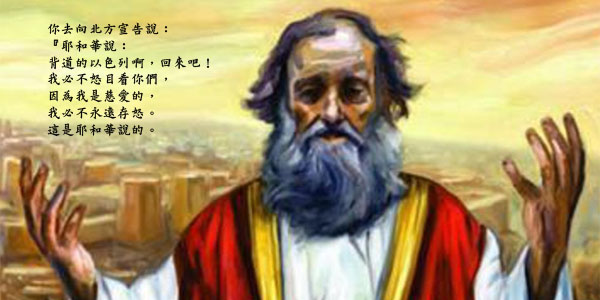 11 耶和華對我說:「背道的以色列比奸詐的猶大還顯為義。 12 你去向北方宣告說:『耶和華說:背道的以色列啊,回來吧!我必不怒目看你們,因為我是慈愛的,我必不永遠存怒。這是耶和華說的。 13 只要承認你的罪孽,就是你違背耶和華你的神,在各青翠樹下向別神東奔西跑,沒有聽從我的話。這是耶和華說的。 14 耶和華說:背道的兒女啊,回來吧!因為我做你們的丈夫,並且我必將你們從一城取一人,從一族取兩人,帶到錫安。