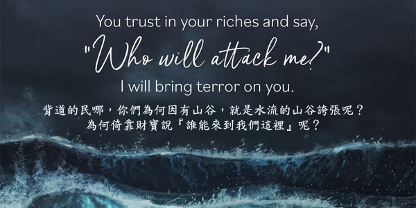 神宣判亚扪人的罪状有二:一为自己地界的山谷形势不易攻打而夸大;二是倚靠自己的财宝。神形容亚扪人在战乱时,将因为恐惧而不停地往前奔逃。但是有一天,神要把那些被掳的人带回来。不管神怎样管教摩押和亚扪,我们都可以从神的怜悯里,再次感受到神对亚伯拉罕和罗得的记念。正如神在〈申命记〉里五章9-10节说的:“不可跪拜那些像,也不可侍奉它,因为我耶和华你的神是忌邪的神。恨我的,我必追讨他的罪,自父及子,直到三四代;爱我守我诫命的,我必向他们发慈爱,直到千代。”但愿我们的虔诚成为后裔永远的祝福。