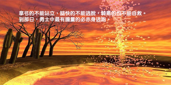 阿摩司書 2:14 快跑的不能逃脫,有力的不能用力,剛勇的也不能自救。