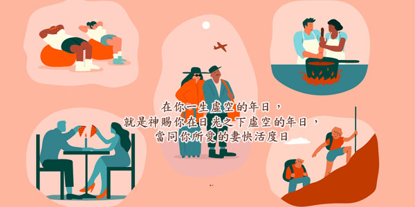 7你只管去歡歡喜喜吃你的飯,心中快樂喝你的酒,因為神已經悅納你的作為。8你的衣服當時常潔白,你頭上也不要缺少膏油。9在你一生虛空的年日,就是神賜你在日光之下虛空的年日,當同你所愛的妻快活度日,因為那是你生前,在日光之下勞碌的事上所得的份。10凡你手所當做的事,要盡力去做,因為在你所必去的陰間,沒有工作,沒有謀算,沒有知識,也沒有智慧。