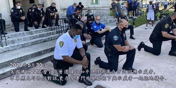 讀了第十章的第二節之後,不知有沒有人刻意檢查一下,自己的心臟長在左邊,還是右邊?很不幸,雖然醫學史上也有一兩個人的心臟是長在右邊,但大多數人的心臟都長在左邊。可見我們都很需要從神來的智慧。若沒有從神來的智慧,我們所選擇的道路往往通向滅亡,或關係的破裂,而不是關係的重建。因為人的心都很剛硬,不柔和。今天的圖片是2020年5月30日在美國佛州拍的。因為46歲非裔美國男子佛洛伊德(George Floyd)在明尼蘇達州遭白人警察壓頸在地,期間曾多次求救,仍不幸身亡. 此事在全美掀起一陣暴力示威,全美有26個城市實施宵禁、13州部署國民兵協助執法。但佛州珊瑚牆市的抗議場面大不相同,來自不同警局的員警單膝跪地,與抗議群眾一同祈禱。他們沒有選擇以暴制暴,而是用最柔和謙卑的方法來安撫民眾。