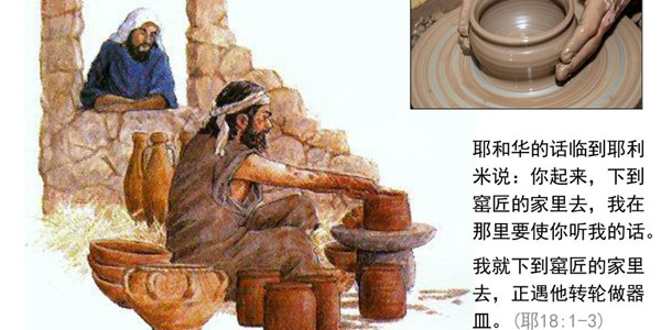 耶利米到窰匠的家中,刚好遇到他正在制作器皿,也正好看见窰匠做坏器皿的情况,既然作不成,窰匠只能重新再造。这里窰匠所作的器皿,是指圆形深底作为容器用的陶土器皿,窰匠之所以会把瓦器作坏,是因为泥质不好,而不是窰匠的手艺不好。
