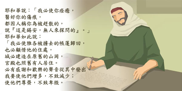 这一章常称为安慰之书,因为书里的信息是神在犹大人被掳之后对他们的安慰和励,并让他们对未来有盼望。神要求耶利米把这段信息写在书上。书是指书卷,当时的埃及人使用蒲草纸书卷,以色列等地区地区则使用羊皮纸书卷。这里所指的被掳之民的回归,不只是被掳到巴比伦的犹大子民,也包括了以色列北国被亚述掳到别的地区的以色列民。神应许他们虽被赶到世界各国,最终都要回归迦南地(巴勒斯坦),成为一个国家,不再分裂。