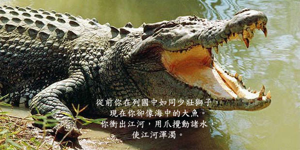 本章先知把埃及比喻為原始的水中怪物,在有生之日禍害人群,而巴比倫則以英勇戰神的姿態擊滅水怪。強權的背後,是神的手在操縱一切。