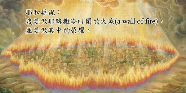 原來新耶路撒冷不再是舊耶路撒冷的形式,她有城牆,同時又無城牆。無城牆,因為不要有限制;有城牆,因為耶和華要作四圍的火城,以火為城牆,並且祂的榮耀要在其中。在舊耶路撒冷裡,神的榮耀在至聖所,但在以西結的異象中,他看著神的榮耀離開至聖所,去到聖殿的門檻,再飛到橄欖山上,停在那裡回頭看耶路撒冷,然後就上升去了。以色列人在公元前536年第一次在被擄後歸回,至今已16年了,他們歸回開始重建耶路撒冷,但不久就停工,已經停了15年。現在復工5個多月,神就讓先知看到這個異象,並告訴他,神要的是新耶路撒冷,神自己要成為火城,祂的榮耀不像過在只住在至聖所,而是在整座城中,沒有聖殿了。耶路撒冷沒城牆,但有火城和神的榮耀,不再靠人的努力去建造城牆來保護自己。
