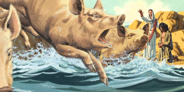 爱在格拉森外邦之地:因着爱,祂释放被污鬼附着的人,鬼入猪群,投海淹死。(太8:28-34,可5:1-20,路8:26-39)