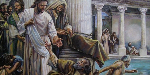 病了三十八年的病人在畢士大池旁等候水動,好進入池子讓病得痊癒,可是水動時,沒有人把他放入池子裡,正去時又有別人比他先下池去。耶穌看見他躺著,知道他病了許久,給他機會讓他得醫治。