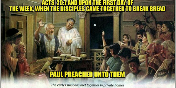 Acts 20:7 On the first day of the week we came together to break bread. Paul spoke to the people and, because he intended to leave the next day, kept on talking until midnight. (NIV)