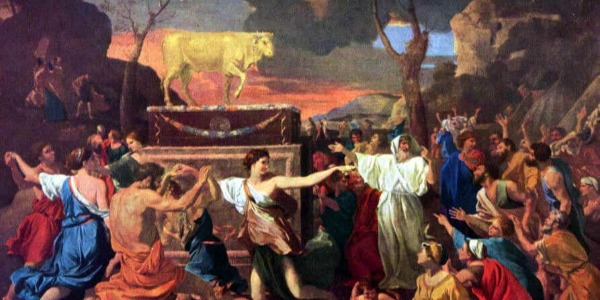 百姓見摩西遲延不下山,就大家聚集到亞倫那裡,對他說:「起來,為我們做神像,可以在我們前面引路,因為領我們出埃及地的那個摩西,我們不知道他遭了什麼事。」亞倫對他們說:「你們去摘下你們妻子、兒女耳上的金環,拿來給我。」百姓就都摘下他們耳上的金環,拿來給亞倫。亞倫從他們手裡接過來,鑄了一隻牛犢,用雕刻的器具做成。他們就說:「以色列啊,這是領你出埃及地的神!」亞倫看見,就在牛犢面前築壇,且宣告說:「明日要向耶和華守節。」次日清早,百姓起來獻燔祭和平安祭,就坐下吃喝,起來玩耍。(出32:1-6)