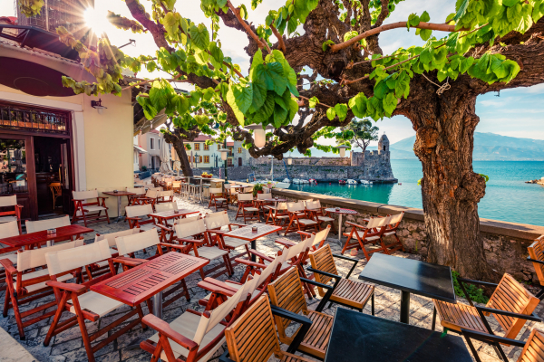 哥林多港邊的戶外咖啡館Sunny summer scene of outdoor cafe in Nafpaktos town. Colorful morning scene of Gulf of Corinth, Greece, Europe. Bright Mediterranean seascape. Traveling concept background.