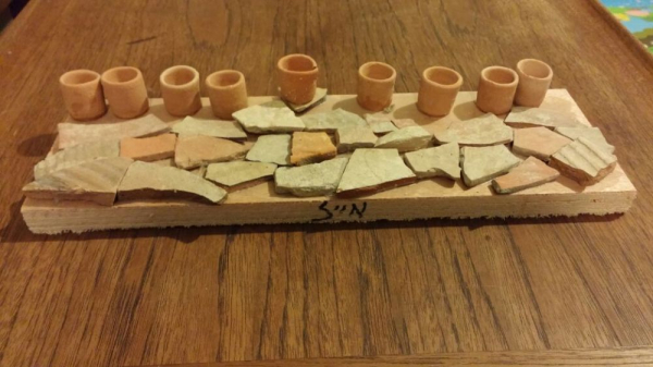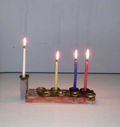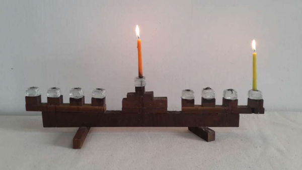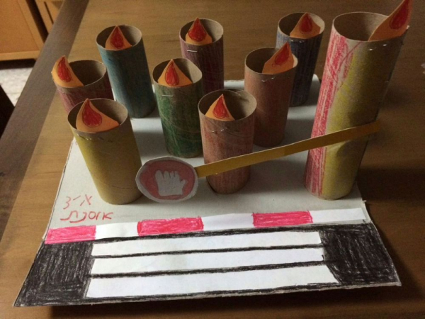 朋友的兒子在幼兒園製作的chanukiah, 材料是汽水瓶蓋和垃圾木材。此為修殿節第三天點燈的情況。