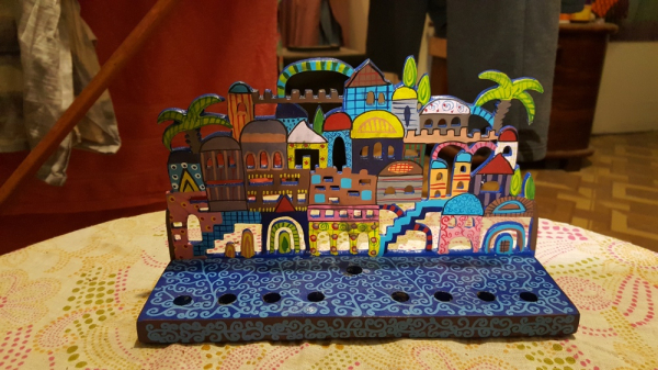 我家的Chanukiah, 是一位叫Emmanuel的藝術家鑄造的, 背景是聖城耶路撒冷