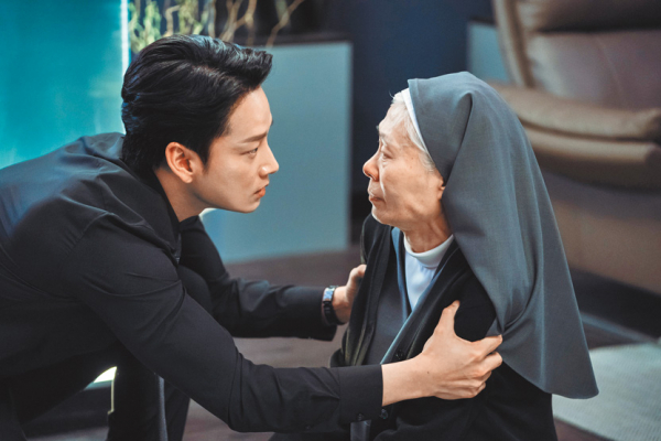 野心勃勃的韓知龍,與知道許多家族秘密的修女。(劇照提供:Netflix)