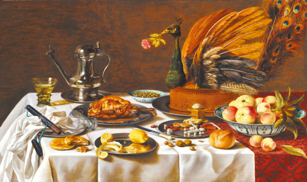 事實上,有許多的虛空畫都以削皮到一半的黃檸檬來表達「時光正在流逝」,而圖畫中的金銀器皿和佳餚強烈影射出:留不住的好時光,沒有什麼是長存的。