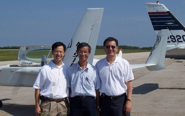 高榮德牧師(中)與教會弟兄於小型飛機前合照