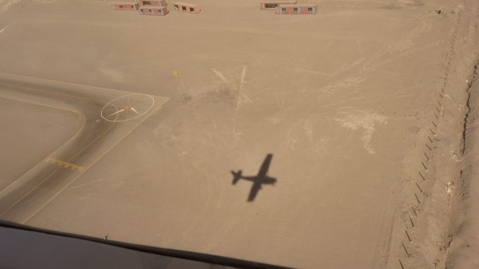 終於,我們來到了一架外型尚稱“完整”,但和高牧師那麵包車一様老舊的飛機前。他停了下來了,笑笑對我說:“這就是了。”飛機上有小鋼繩,把飛機緊繫在地上。他很熟練地解開,然後打開機門,告訴我,這架飛機可載5人。