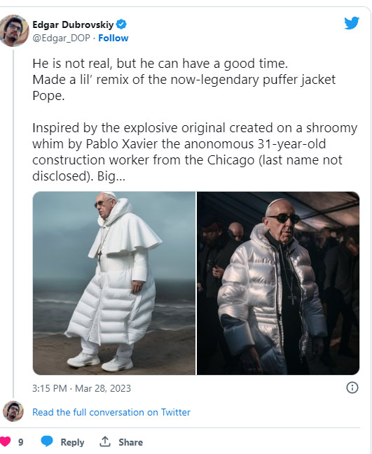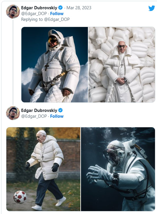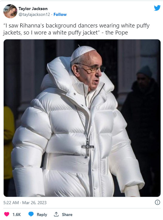這張教宗照片的創作者巴布羅.澤維爾(Pablo Xavier)告訴網路媒體《Buzzfeed》:「我只是覺得人們要是看到教宗穿著這樣的外套,一定會感到很有趣。」身為基督徒的英國媒體內容策略家安德鲁.霍頓(Andrew Horton)表示,人工智慧的進步,意味著圖像可以被操縱,這樣我們就不能再相信我們所看到、聽到或讀到的訊息;正如教宗的假照片所示,基督徒必須警惕錯誤信息。