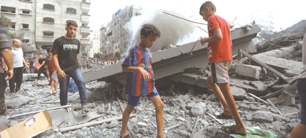 在加薩的難民營,孩子們走在被空襲摧毀後的廢墟中。(兒基會 by Mohammad Ajjour)