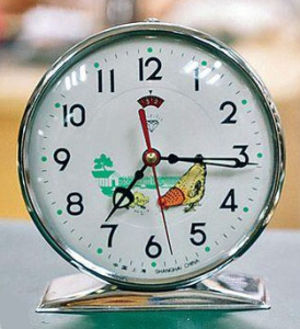 一天有位中年婦女領著孩子來參觀,那是個非常招人喜歡的小男孩,他趴在我們櫥窗前,不願走開。當時我們出售一款活動體鬧鐘,圖案是『雞啄米』,隨著秒針走動,雞群會一下一下啄米吃。