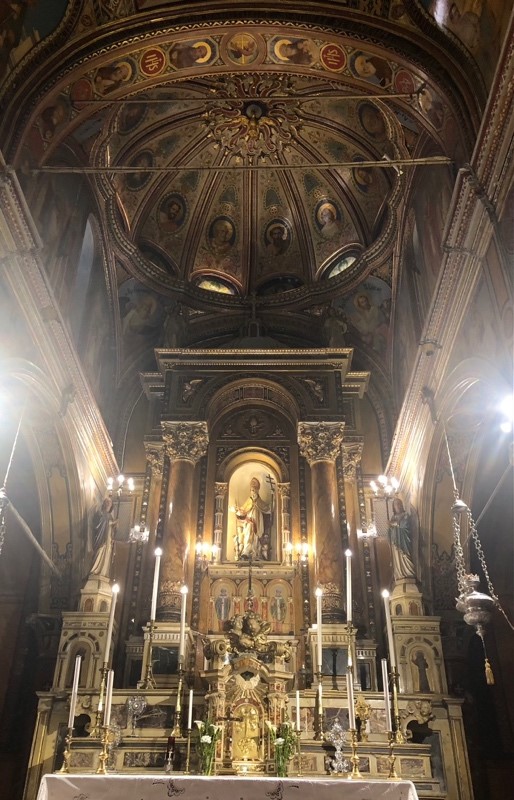 圓頂的鑲嵌畫大部分被石膏覆蓋,少數存留的被白布遮住,原來是聖母抱著聖嬰的圖像。難怪教會歷史上以“上帝之母”來稱呼馬利亞——主耶穌是馬利亞藉聖靈感孕所生,她是基督人性的母親。