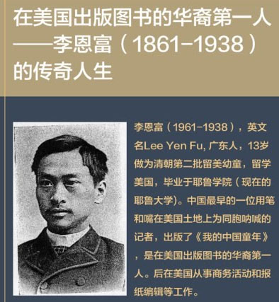 1887年,他寫《我在中國的童年》 (When was a boy in China) ,讓美國人認識華人,這是世界上,第一本由華人寫作的英文書。