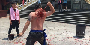 後來,我學會操五寶,就是上半身裸露,踩著王爺步,佯裝神明附身,拚命用狼牙棒拚命操自己的身體,直到見血為止。當時謠傳維士比藥酒可以補充血液,減少疼痛感,我為了增加自己的血量,就開始喝酒。從此我的青春歲月就在陣頭裡混,結交各種酒肉朋友,以致後來接觸毒品,墜入黑暗的深淵。
