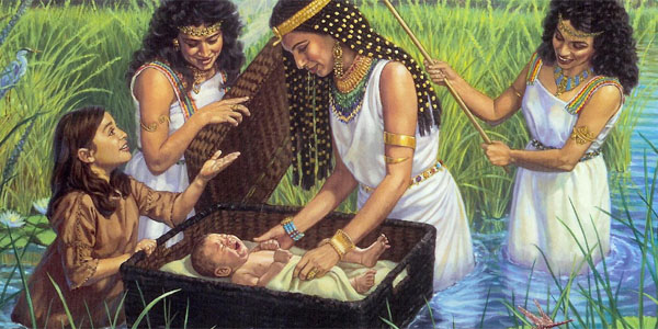 摩西本人原是某個希伯來奴隸的兒子,卻逃過法老的殺嬰令,存活了下來,當他出生時,父母親並沒有將他丟到尼羅河裡淹死,反倒將他放在一個籃子裡順河漂流。後來法老的女兒發現他,便把他帶回皇宮,當成自己的兒子撫養長大。
