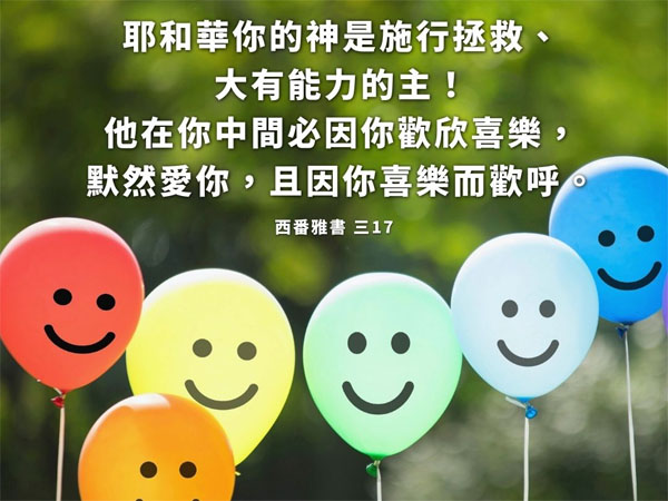 耶和華─你的神是施行拯救、大有能力的主。祂在你中間必因你歡欣喜樂,默然愛你,且因你喜樂而歡呼。(西番雅書3:17)