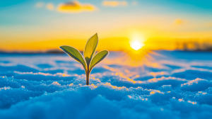 Young green plant sprouting through snow at sunrise, bright sky. Renewal and hope concept.