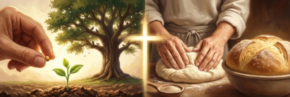 但很快地,樹的故事出現翻轉。耶穌被高高釘死在十字架上,就好像一顆掛在枯乾之樹乾癟的果子。祂死後,亞利馬太的約瑟把祂的屍體取下來,放在一個山洞裡,也就是約瑟為自己預備的墳墓。耶穌在墳墓裡,被石頭封存,像是一粒種子被埋進大地,無聲無息。祂身體的種子,似乎死了。然而,受難週的第六天是發芽的日子,種子準備破土而出,結出纍纍的碩果(約翰福音12章24節)。