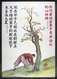 福音書講述了關於樹的故事。這要從施洗約翰說起,他傳講悔改的福音,警告眾人「斧子已經放在樹根上」(馬太福音三章10節),凡不結好果子的樹將被砍倒,丟在火裡。耶穌重申了這個警告。樹好壞與否,結的果子能告訴我們,好樹結好果子,壞樹結壞果子,後者注定要丟在火裡燒掉(馬太福音7章17-20節)。