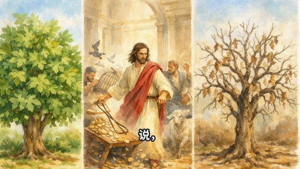 馬太將潔淨聖殿與無花果樹枯乾兩事件並列,在馬可福音十一章12-26節,這兩件事則構成一個典型的「馬可式三明治」(Markan Sandwiches):耶穌咒詛無花果樹─耶穌清理聖殿─無花果樹枯萎。馬太和馬可都希望我們看到這兩個事件之間的某種聯繫,對樹的警告提供了線索。耶穌來到聖殿,想要尋找證據,證明聖殿是棵好樹,但它成了強盜的藏身之處,而不是禱告的聖所。祂咒詛不結果的無花果樹,象徵對聖殿沒有果子的咒詛。這是一個更尖銳的警告,警告即將到來的大火會讓聖殿焚毀。
