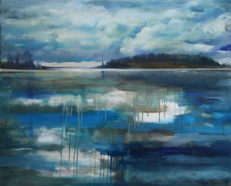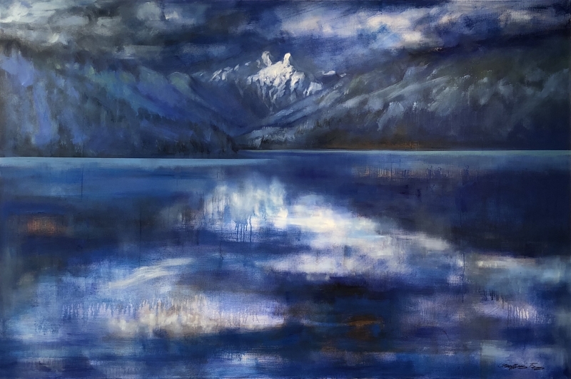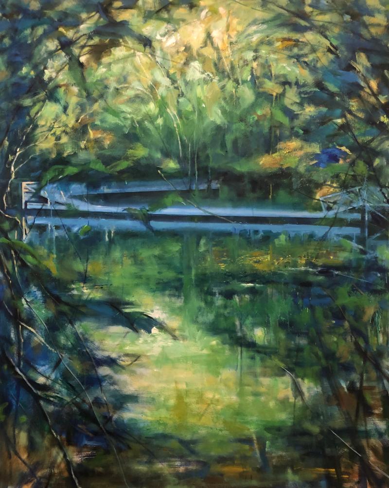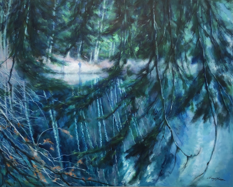 創作心得:靈感來源於北溫哥華Lynn Valley的Rice Lake,這是畫家時常跑步默想的地方。湖光樹影,造化見證。風動垂枝,靈意輕訴。