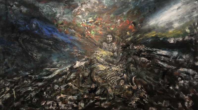 創作心得:作品題目取意莎士比亞的文字,而其隱喻內涵則源自聖經。當我們回望苦難的歷史,若能心臨其境,就必驚駭顫栗,哀痛難言。幽暗世界,邪惡掌權。作品透過看似抽象、碎片化的圖式傳達,引人進入恐懼壓抑混亂的場景,然而畫面的對角線十字構圖,稍加留意便能被迅速識別。當中各局部的細節觀看能使人發覺眾多的具象表達,隨即展現出清晰的喻意指向。至暗史時,看誰同在?