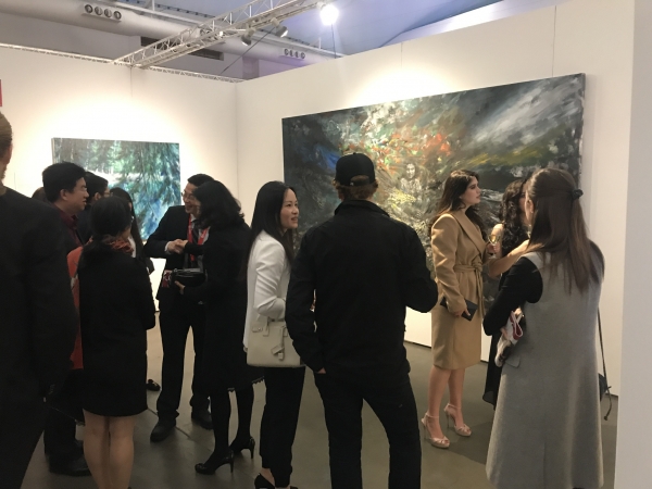 上圖:Art Vancouver2019溫哥華國際藝術博覽會展出草非的三幅新作,作者正在與包括策展人和收藏家在內的觀眾進行深入交流。下圖:2019融空間/ACC美術館展出